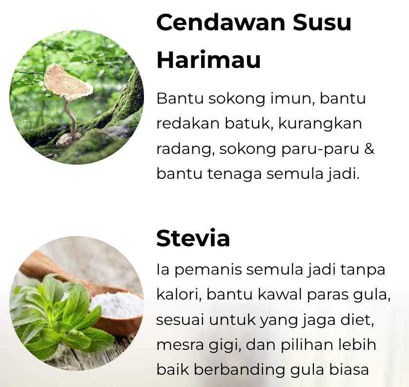Diformulasikan dari 4 tumbuhan superfood seperti Daun Moringa, Sacha Inchi, Cendawan Harimau Susu & Stevia. Ia bertindak dari dalam untuk membantu: